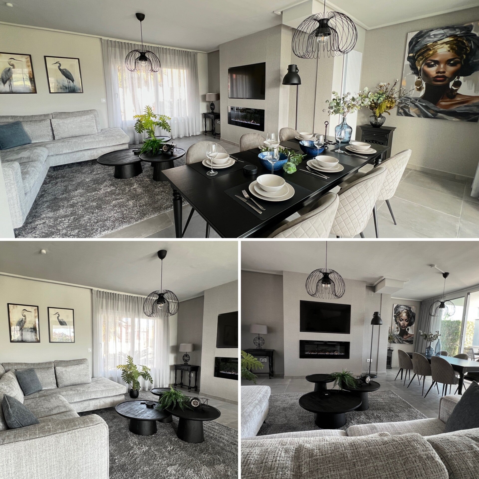 Relax in Villa Oliver's stylish living room, complete with new furniture, a luxurious corner sofa, and a large smart TV. The TV is integrated into a modern cinema wall with an electric fireplace, creating a warm, cozy atmosphere for relaxing evenings together. Air conditioning and central heating ensure perfect comfort, regardless of the season.
