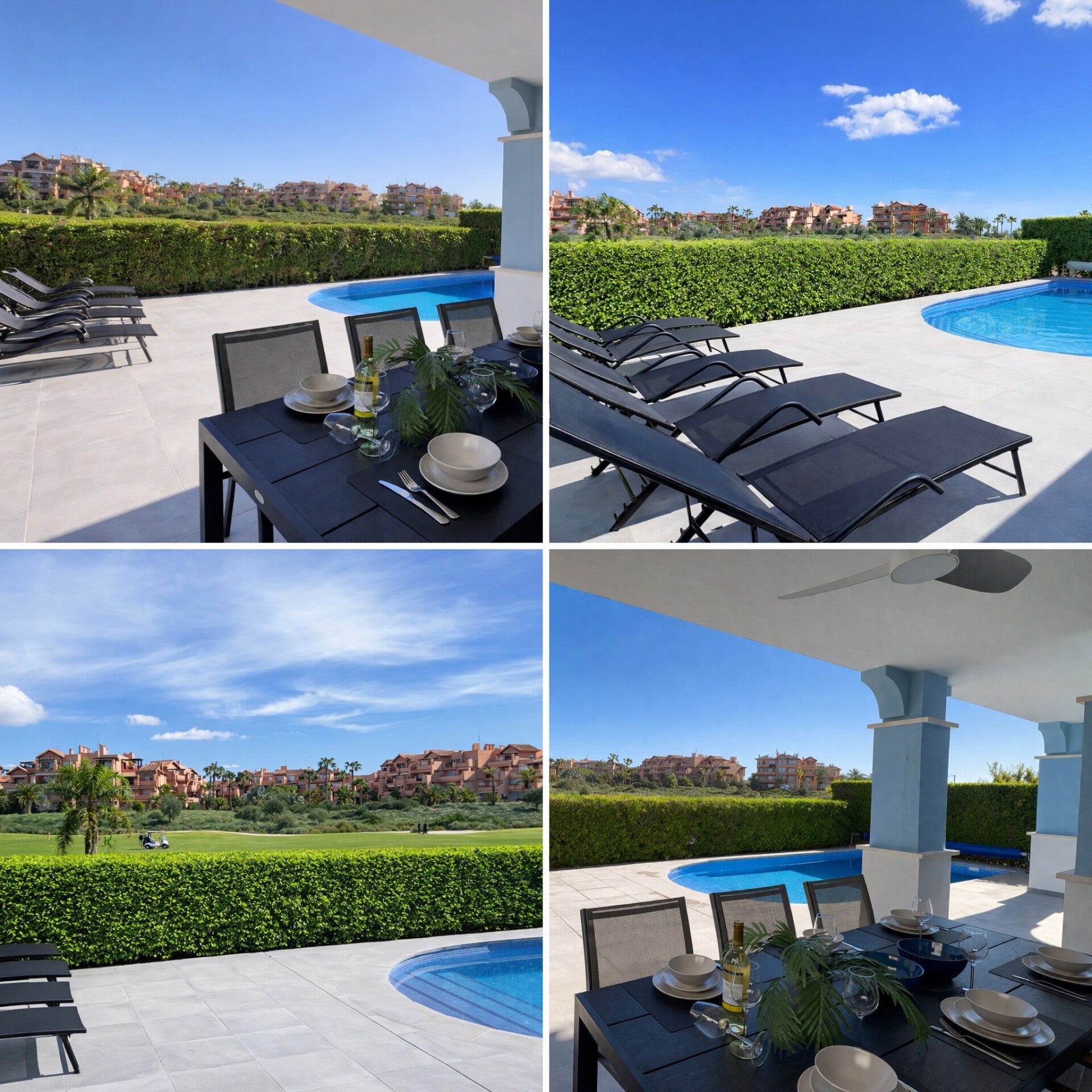 The spacious garden features a private pool with six comfortable sun loungers, perfect for relaxing in the sun. The large dining table with comfortable chairs is the perfect place to enjoy breakfast, lunch, or dinner together while overlooking the green fairways.
